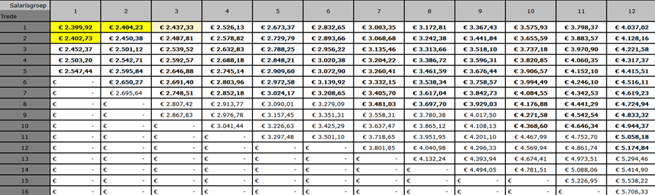 Wat betekent dit voor de CAO Tentoonstellingsbedrijven? Sociale partners zijn in overleg over verlenging van de CAO, waarbij gestreefd wordt naar de datum van 1 juli 2026. Daardoor wordt de loontabel zelf niet aangepast. Echter de geel gemarkeerde groepen & treden komen per 1 januari 2026 onder het wettelijk minimumloon en moeten aangepast worden op het minimumloon in de salarisadministratie.